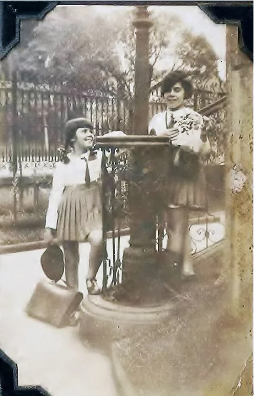Renata e Yolanda posando de uniforme ao lado do belo gradil da entrada. Ano 1932.