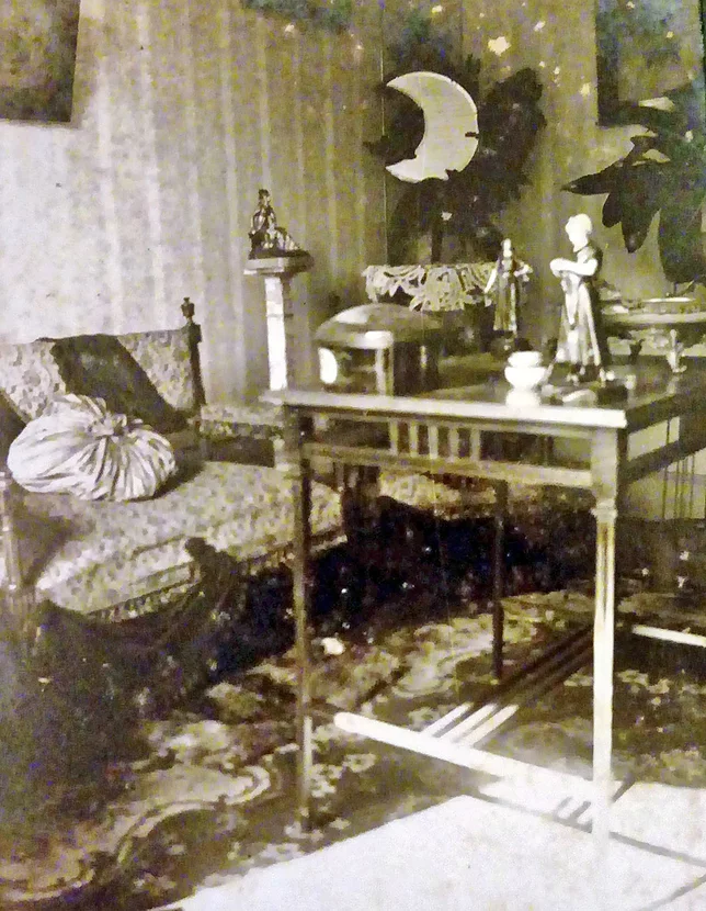Nas fotos acima e abaixo vemos alguns ângulos da sala de visitas com seu papel de paredes e a mobília forrada de veludo. Inúmeros objetos enfeitam a sala, muitos no estilo art nouveau, tão em moda na época