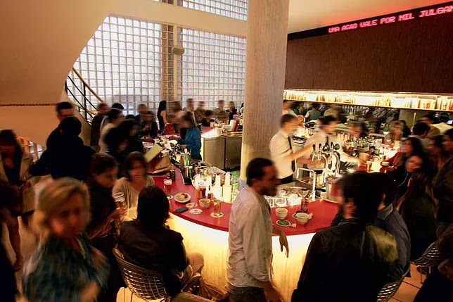 O projeto do bar é do arquiteto Marcio Kogan, que preservou a parede curva de vidro que marcou o lugar e a caixilharia de vidro com vistas para a cidade de São Paulo. O ambiente que possui 300m² acomoda até 200 pessoas.