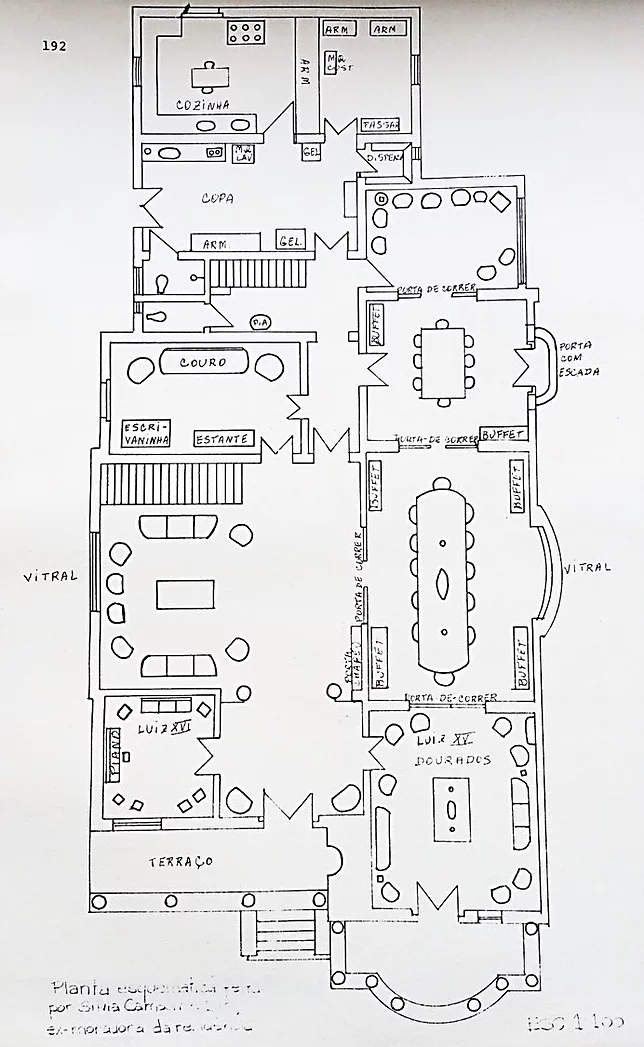 Entremos para o interior da residência. Para melhor acompanhamento do trabalho realizado pelos profissionais, abaixo podemos ver a planta do piso principal do palacete Camasmie. Várias salas, duas delas especialmente nomeadas conforme o estilo: a sala Luis XV, na qual predominava os ornamentos dourados, e a Luis XVI, uma sala de música, onde ficava o piano.