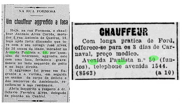 O primeiro registro que encontramos da Avenida Paulista, número 50, é de um chauffer (motorista particular) que morava nos fundos da casa que lá deveria existir. Trata-se de uma notícia que ele, chamado José Alves, com 30 anos, levou uma facada na Rua Formosa, e foi ferido gravemente, por causa de uma discussão com um amigo. O outro registro é, provavelmente, do mesmo chauffer que se oferece, por preço módico, para guiar nos três dias do carnaval e afirma que tem longa prática no Ford.