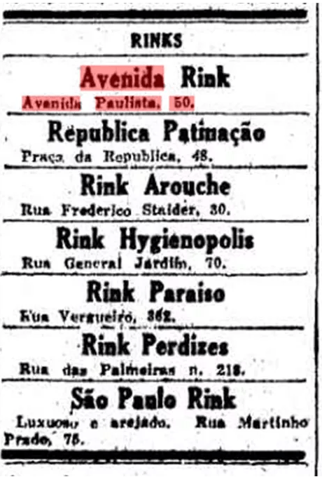 Depois disso, em um anúncio publicado no Estado de São Paulo, no dia 8 de janeiro de 1932, ficamos sabendo que o endereço foi um “Rink” de patinação: o Avenida Rink. Vejam que interessante, nesta época, a cidade tinha vários ringues de patinação. Abaixo o anúncio de jornal que publica o endereço da Avenida Paulista e vários outros locais para patinação.