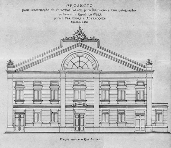 E, em seguida, o projeto arquitetônico com a fachada posterior do Skating Palace, que foi construído em 1911 na Praça da República, número 52, esquina com Rua Aurora. Reparem na beleza e no detalhamento do desenho que concentraria o rink de patinação e um cinematographo, solicitado pela Cia, Sport e Actracções.