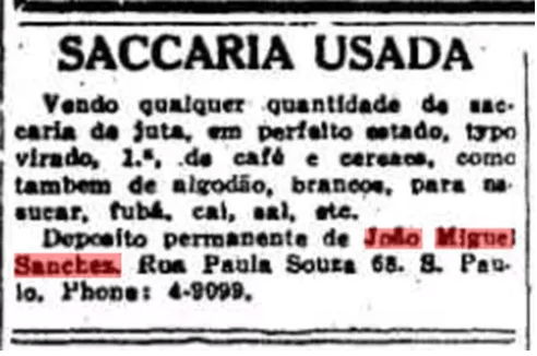 Linda e exuberante a casa, não é mesmo? Porém, pouco sabemos de seu proprietário, João Miguel Sanches. Conseguimos descobrir que, em 1934, ele vendia “todo tipo e qualquer quantidade de sacaria de juta, em perfeito estado”, que eram já usadas e reutilizadas para ensacar café e cereais e, também, sacos de algodão brancos, para açúcar, fubá, cal, etc.