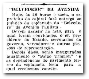 O charmoso mirante, com salões e restaurante, existiu por 37 anos no local onde hoje é o MASP. O Belvedere Trianon era um mirante, com terraços panorâmicos que proporcionavam a vista para todo o vale, para a avenida e para os jardins do Parque Trianon. O local também era conhecido como Miradouro da Avenida ou apenas o Belvedere da Avenida (…). O escritório de arquitetura de Ramos de Azevedo, um dos mais conceituados na época, assinava a obra.