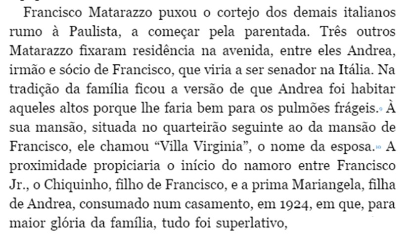 Sobre a Villa Virginia Matarazzo sabemos que foi construída em 1905 com projeto do engenheiro Fortunato Nigro. As únicas informações que tivemos acesso é um trecho do livro “A capital da vertigem – uma história de São Paulo de 1900 A 1954” de Roberto Pompeu de Toledo, que reproduzimos abaixo: