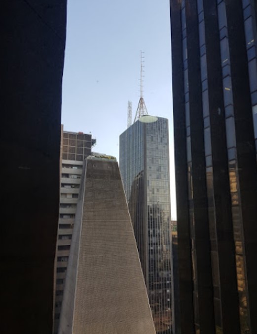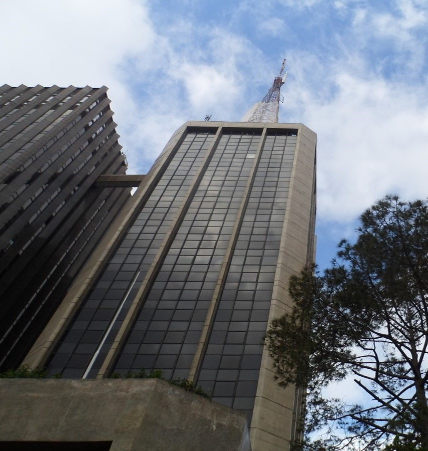 Torre de base quadrada (..) em linguagem formal simples e elegante, definida pelos pilares de concreto aparente e caixilharia escura. Sua racional estrutura de pilares centrais e periféricos libera áreas livres nos pavimentos-tipo com uma transição no térreo em um único pilar central. Embasamento composto de corpo baixo horizontal piramidal, destinado à agência bancária.