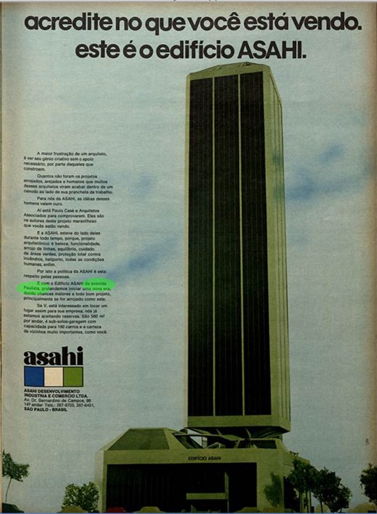 Em seu lançamento o anúncio apresenta a relação do arquiteto com sua obra e com a empresa Asahi, que apoia o projeto arquitetônico moderno, ressaltando a beleza, funcionalidade, arrojo das linhas, equilíbrio, cuidado com áreas verdes, proteção contra incêndios, heliponto, todas as condições humanas do edifício.