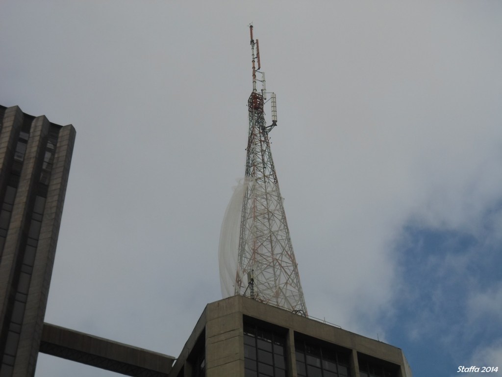 Torre ficou presa por apenas 12 dos 32 cabos que a sustentavam; houve pânico e avenida foi interditada. Vento forte entorta antena na Paulista.