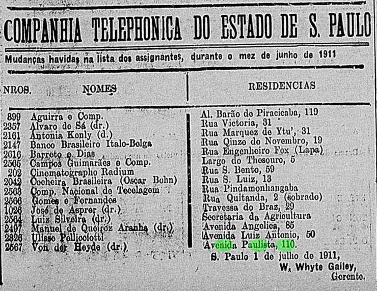 Von der Hayde aparece, em 1911, na lista de telefones da Avenida Paulista