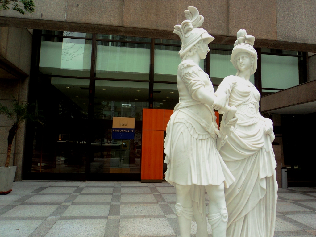 Logo na entrada, próximo as portas da agência do Banco Itau Personnalite, vemos duas esculturas clássicas, um casal que se entreolha.