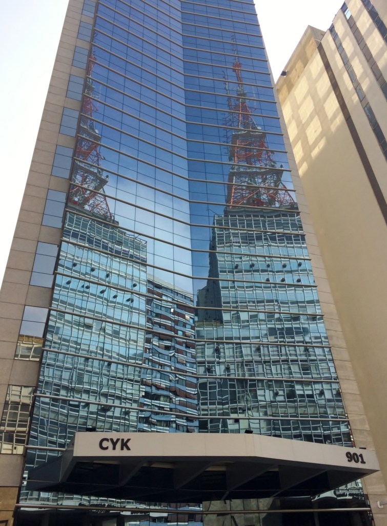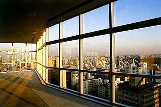 E, por fora, dependendo do sol e do horário do dia reflete de forma inusitada as antenas dos edifícios no outro lado da Avenida Paulista.