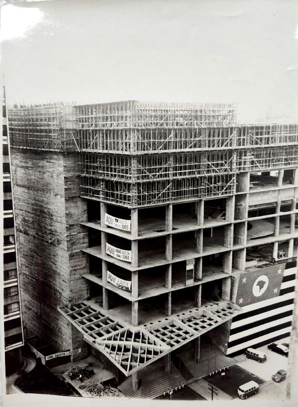 Em seguida, a foto mostra o que já foi mencionado acima: as placas com os dizeres do que seriam cada andar e quando estariam prontos. No térreo com o Cine Gazeta, no segundo andar, o jornal Gazeta Esportiva, no terceiro, radio Gazeta, previsto para 1964 e, no quarto, a Tv Gazeta, em 1965.