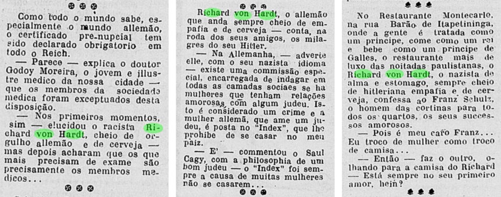 Em meados da década de 1930, o semanário italiano Il Moscone, impresso no Brasil, publicou várias sátiras dirigidas ao Sr. Richardt von Hardt, em que o chamava de racista, nazista, hitleriano, alemão cheio de empáfia e cerveja, como pode ser lido nas historietas abaixo.